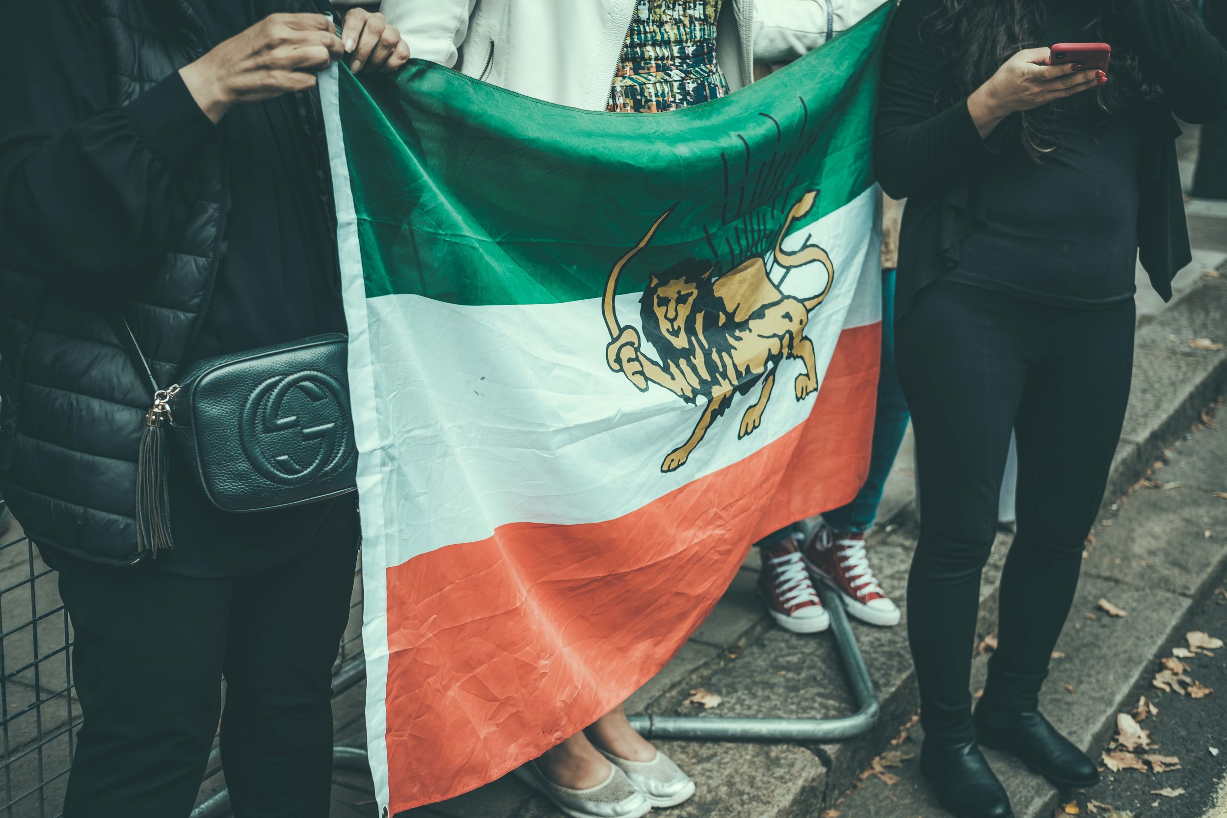 Crowd of people at a protest or rally holding signs and flags, including an Iranian flag, with buildings and trees in the background.