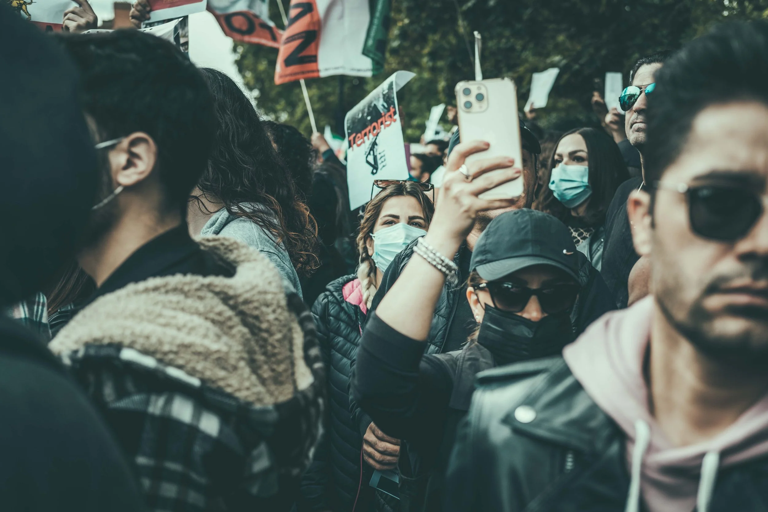 Crowd of people at a protest, many wearing face masks, some holding signs and taking photos.
