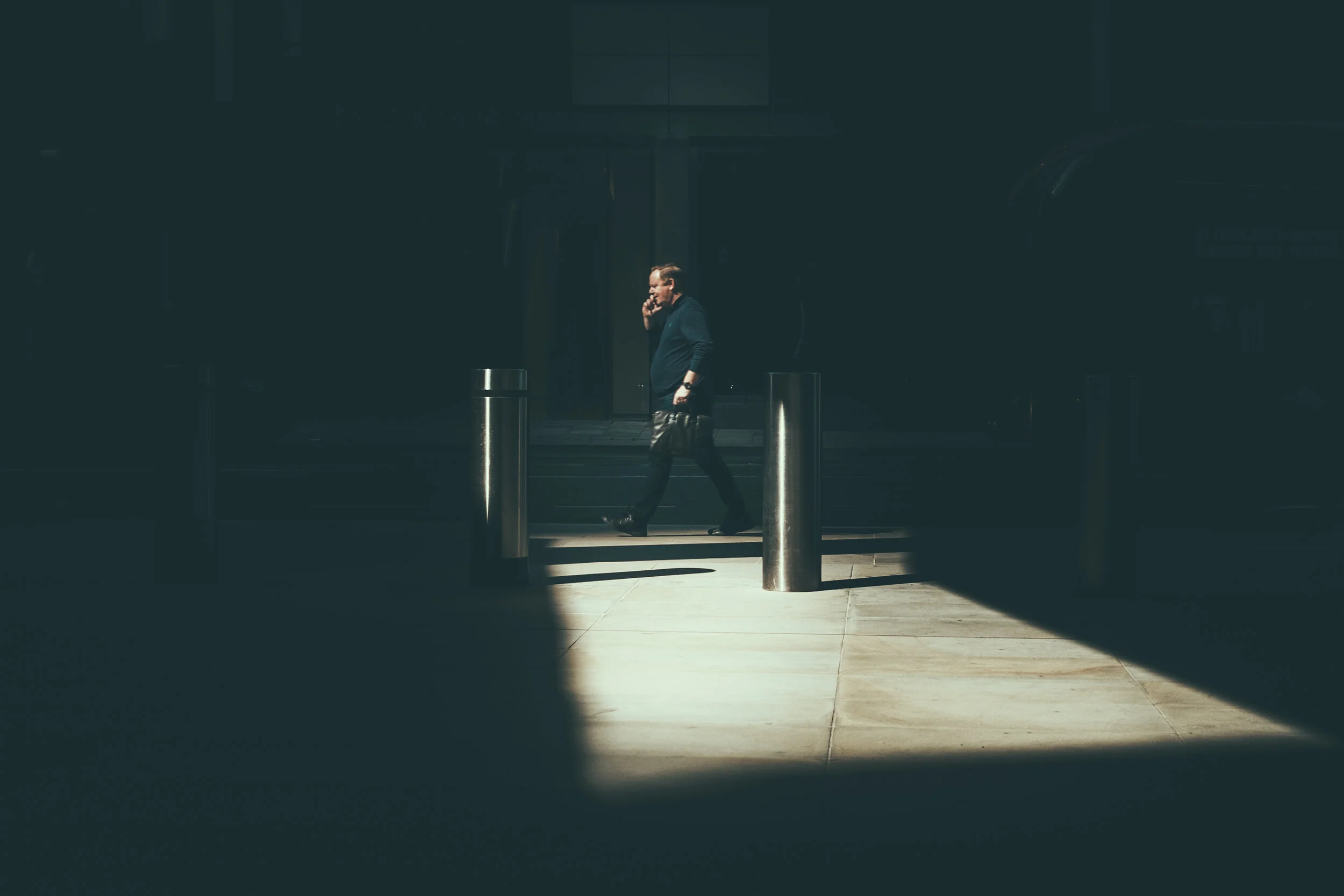 A man walking through a dark area of an urban building, talking on his cellphone, illuminated by sunlight from outside.