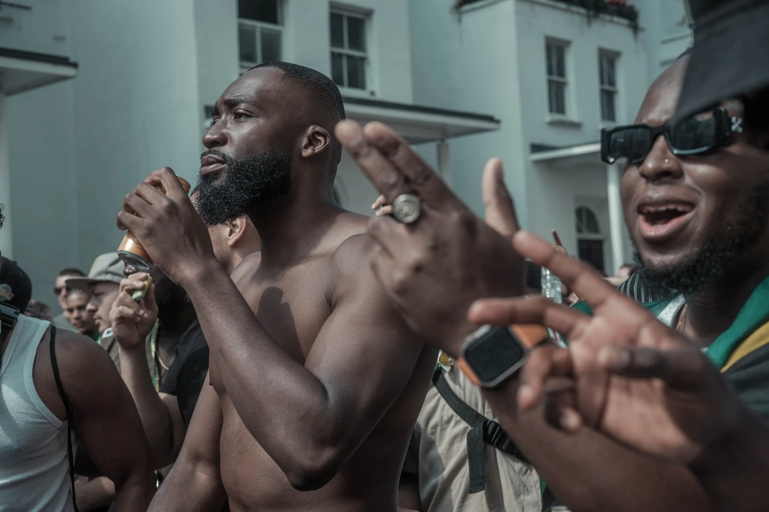 A shirtless man flexes his arm in a crowd during a street event, with various people in the background, some with accessories and others holding flags.