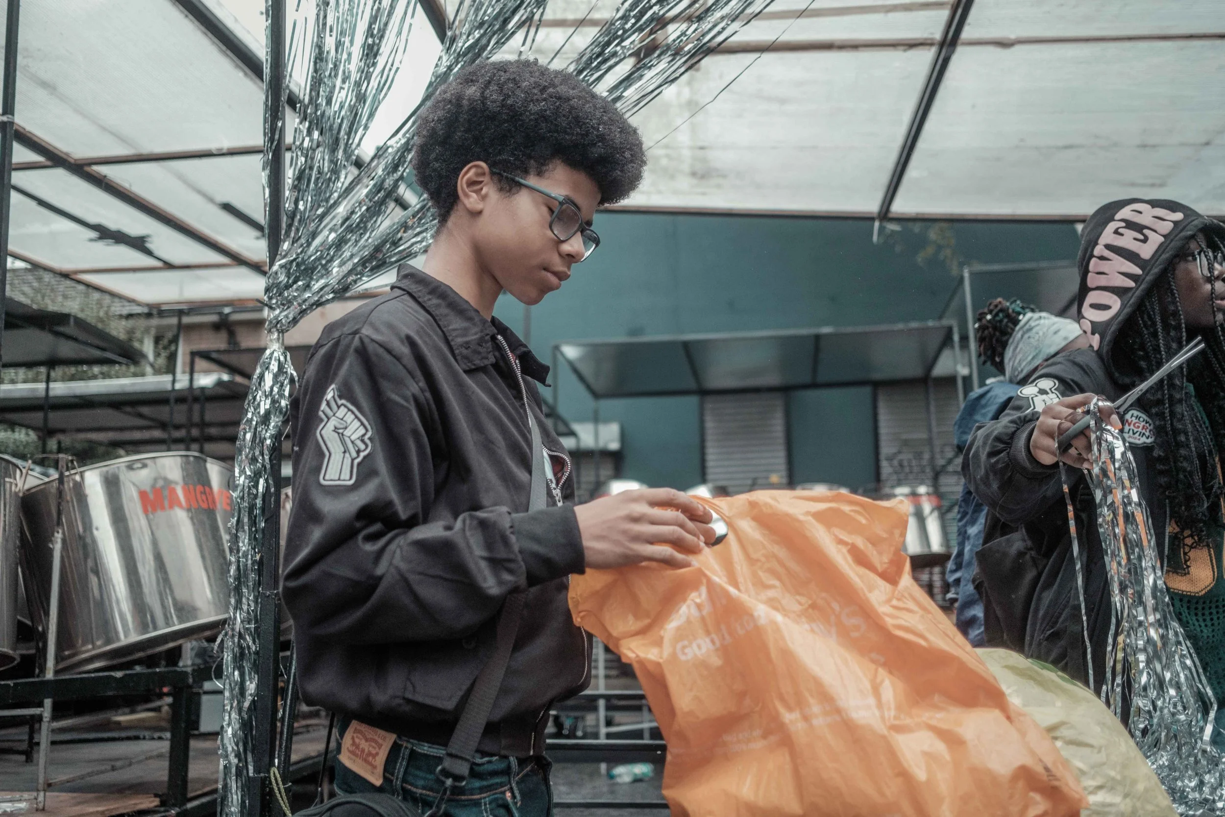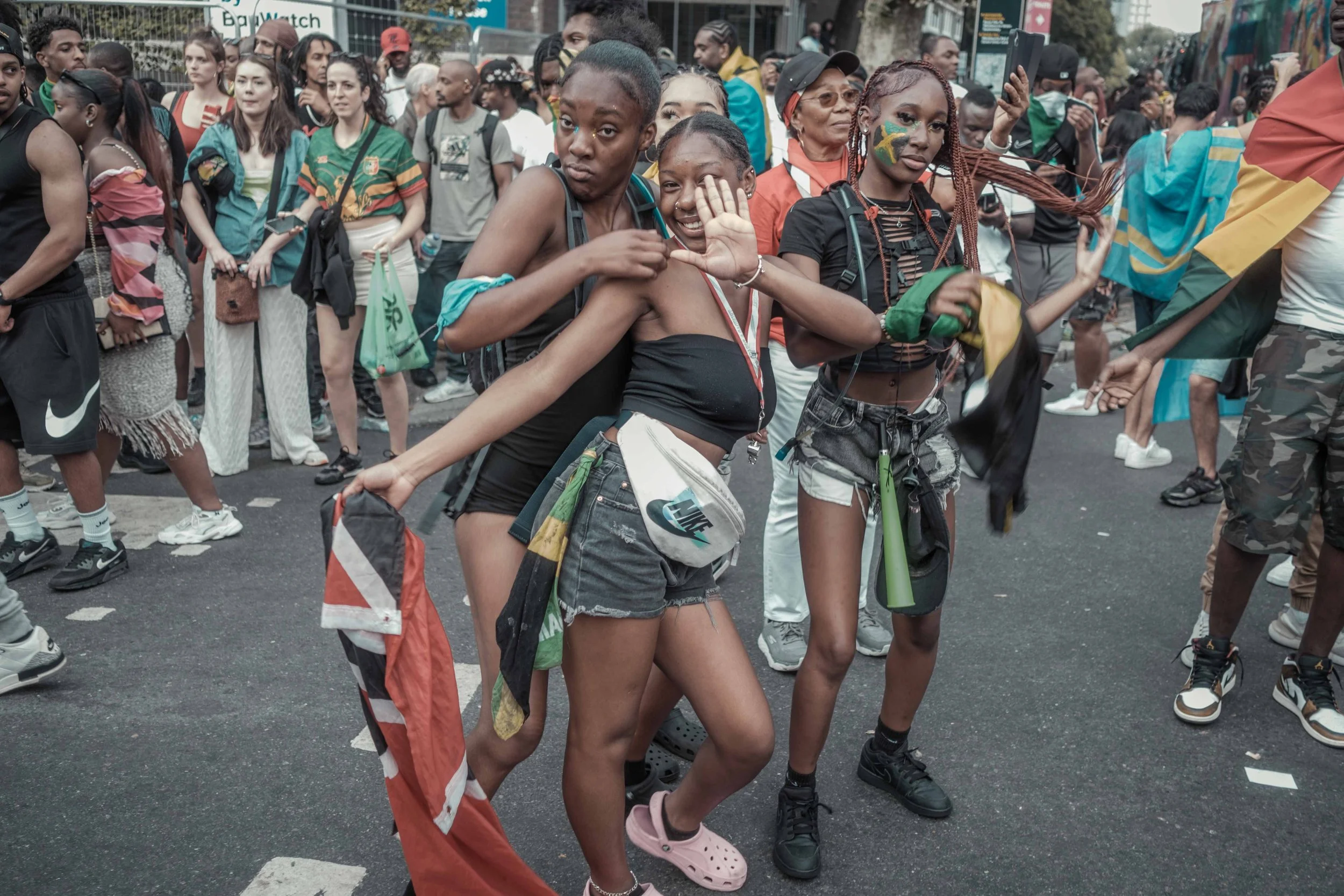 Close-up of two people at an outdoor event. The person on the left has braided hair, earrings, and is wearing a black crocheted top. The person on the right, seen from behind, is wearing a blue graphic T-shirt with a patch that reads "NOTING HILL CAR