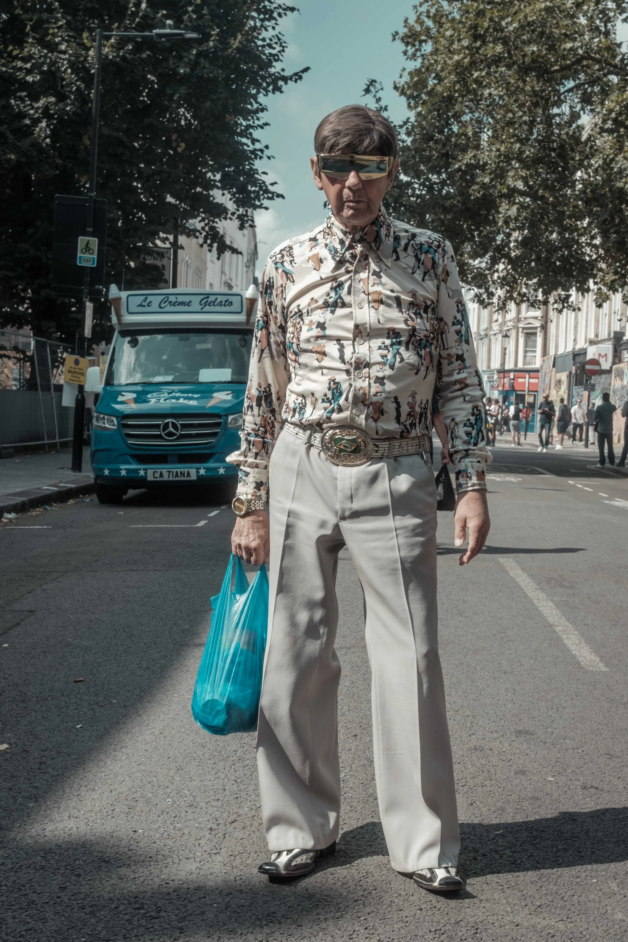 A man wearing a beige bucket hat, sunglasses, a white T-shirt, and a backpack is dancing or posing with one arm extended. He is at a lively outdoor event with many people in colorful costumes and accessories, some of which include feathers, beads, an