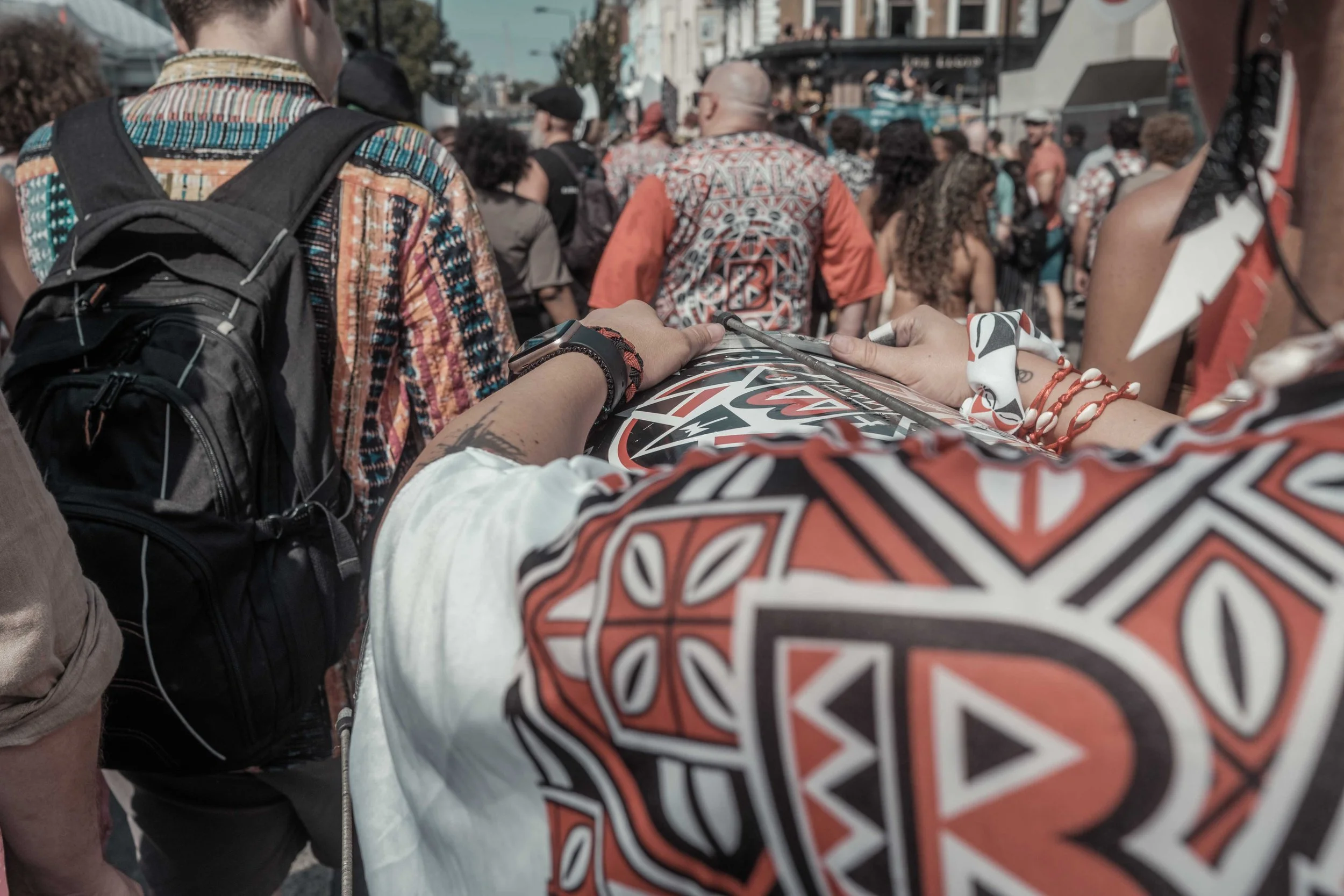 A lively street celebration with people dancing, wearing colorful clothing and accessories, with a diverse crowd including some participants in traditional attire.