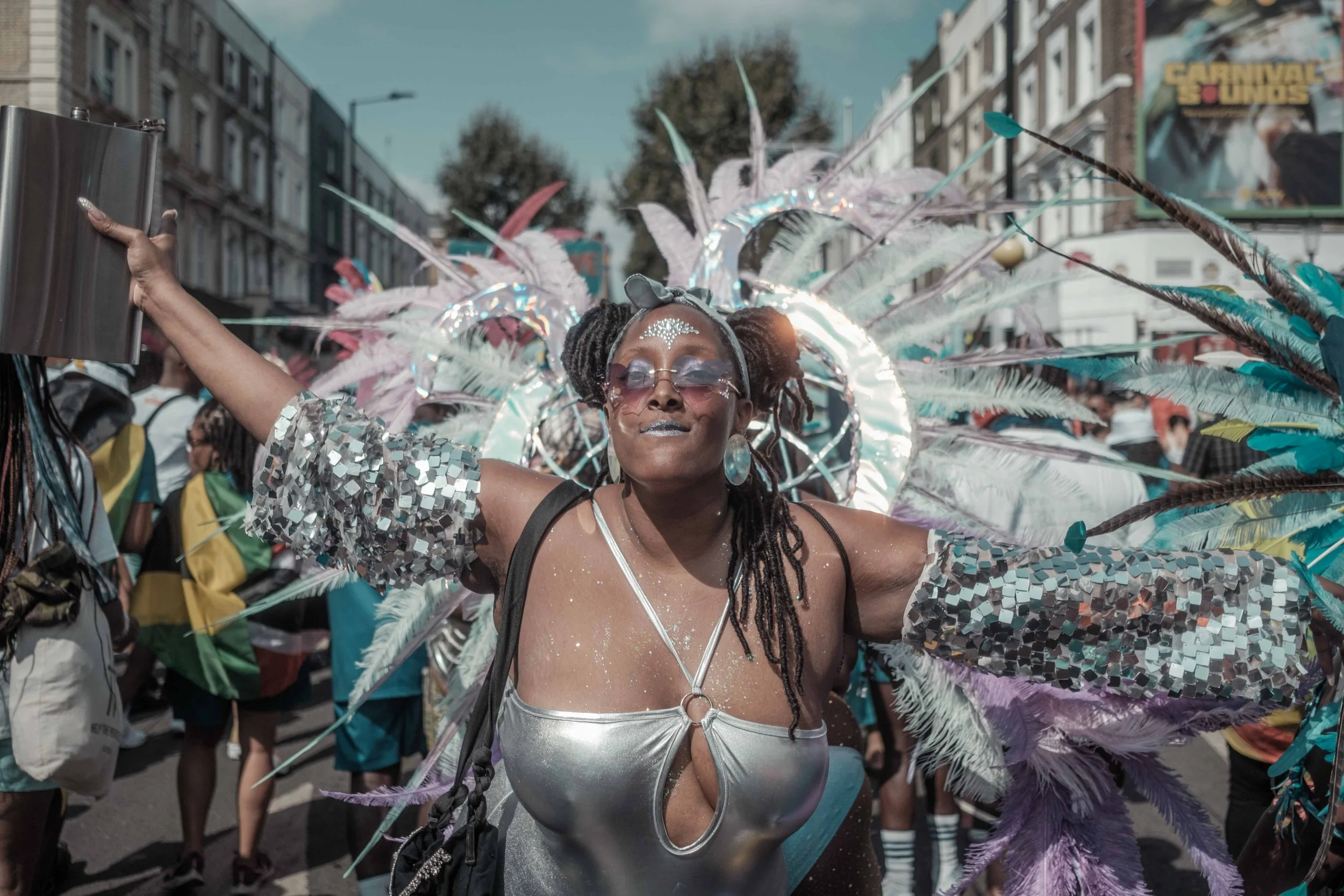 A smiling woman dressed in colorful carnival attire with feathers and jewelry, celebrating at a festive event.