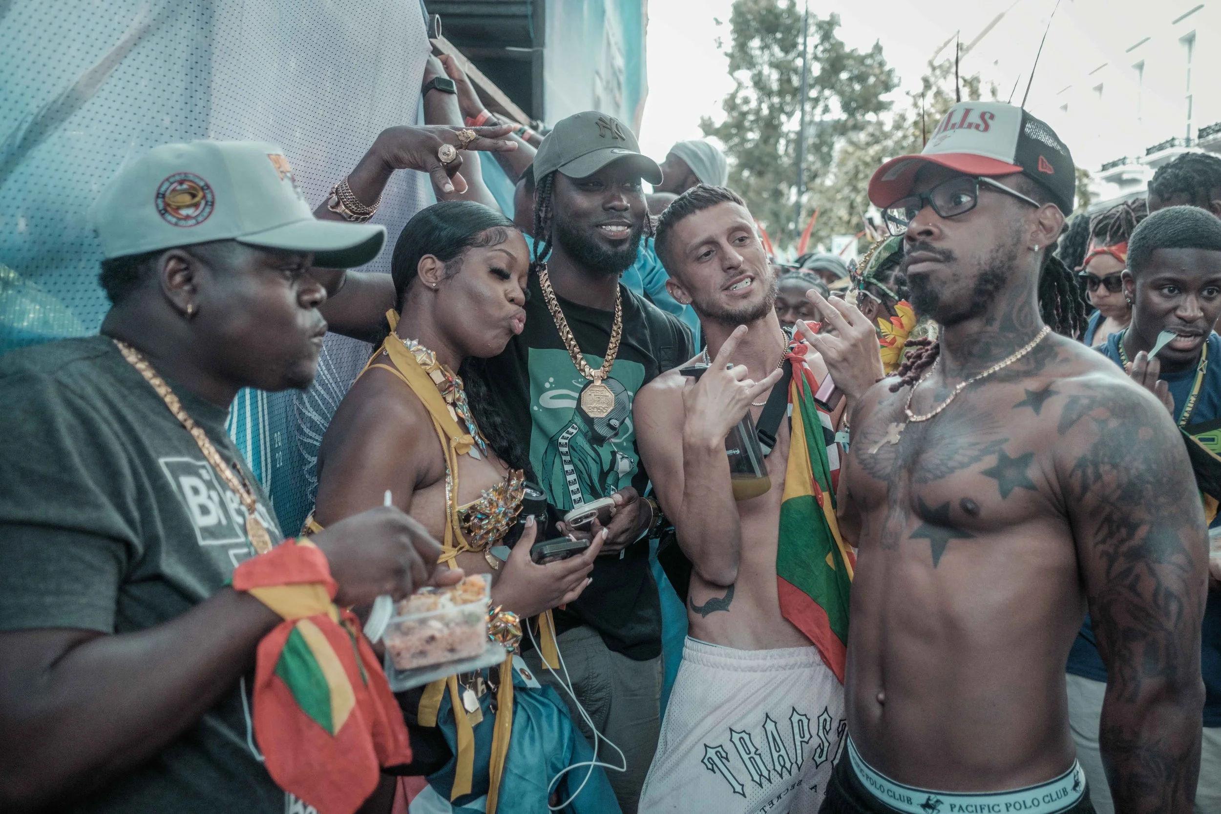 A group of mostly young adults at an outdoor event, with some wearing sports or celebratory attire. Several are holding drinks, and some are posing for a photo, displaying gestures and expressions indicating excitement or camaraderie.